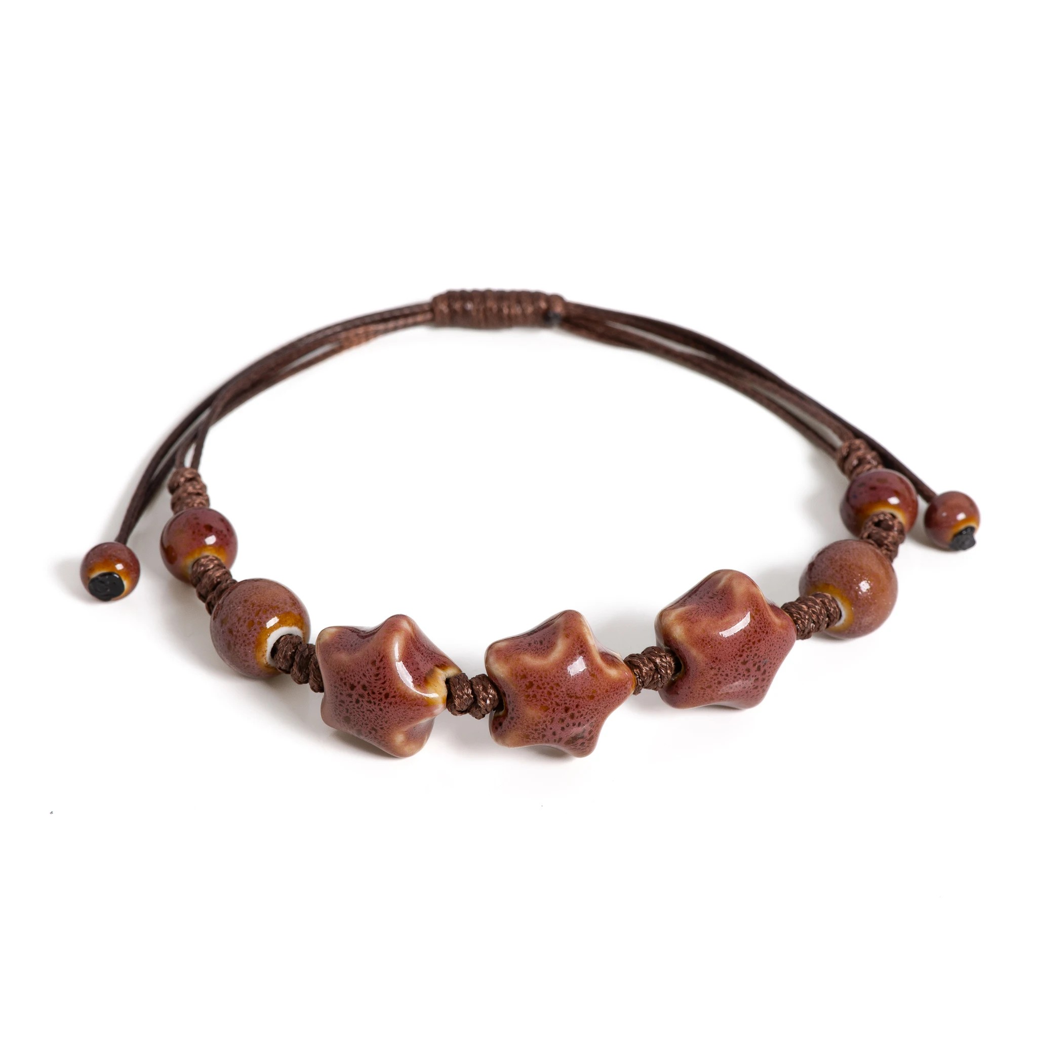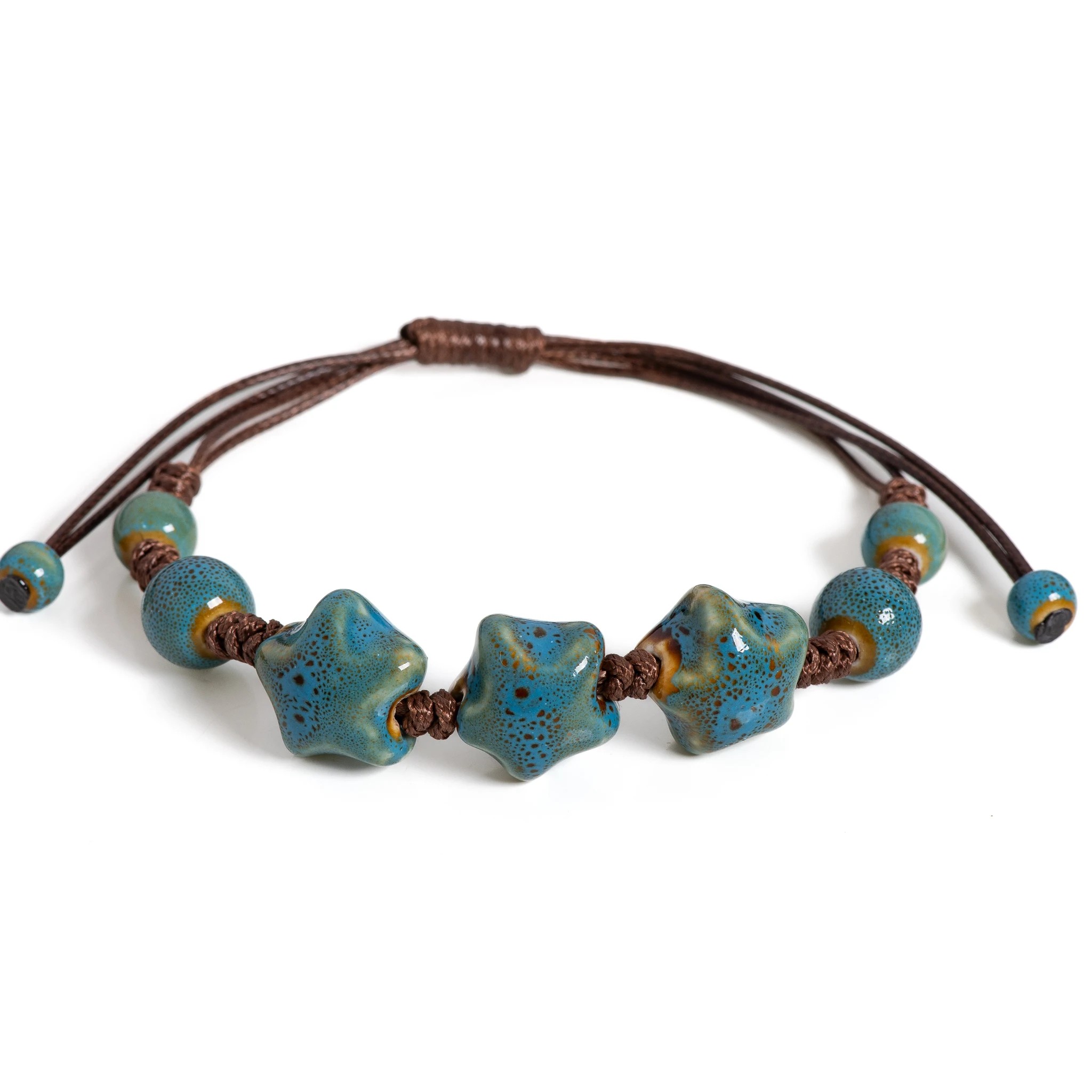 Unisex Handcrafted Glazed Ceramic Bracelet with Star, Adjustable Cord 12-24 cm, Star Bead Size 1.6 cm