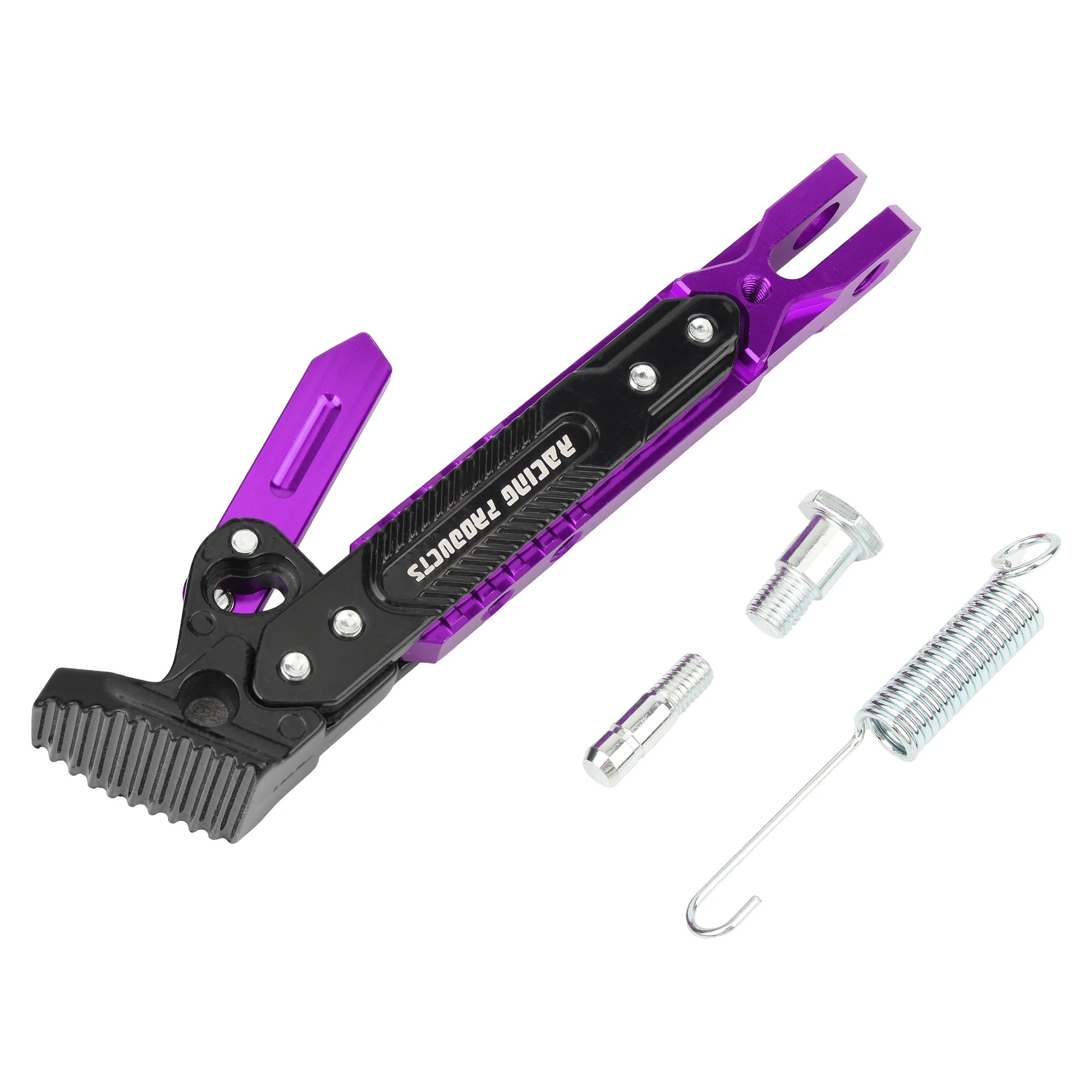 Durable adjustable motorcycle side stand with a coloured design, spring, and mounting screws. Universal use for various brands. Full description