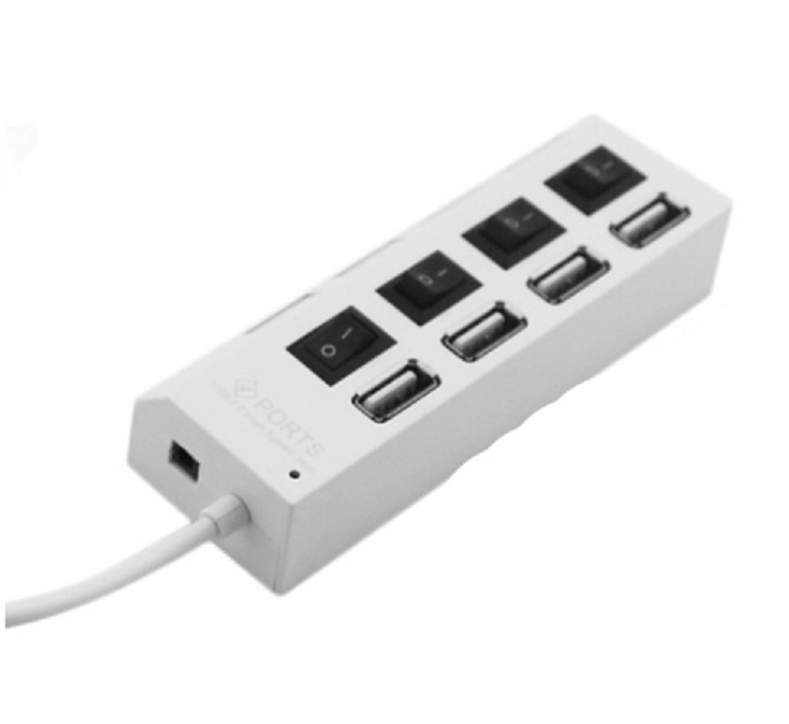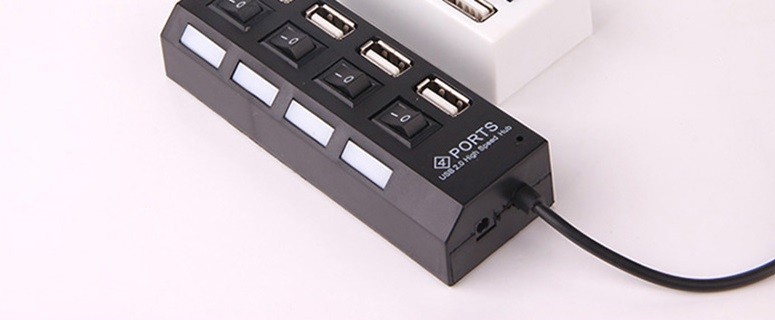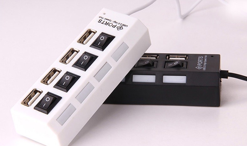 The hub features a stylish design with switches with LED lights for each port, allowing you to turn each device on and off individually.