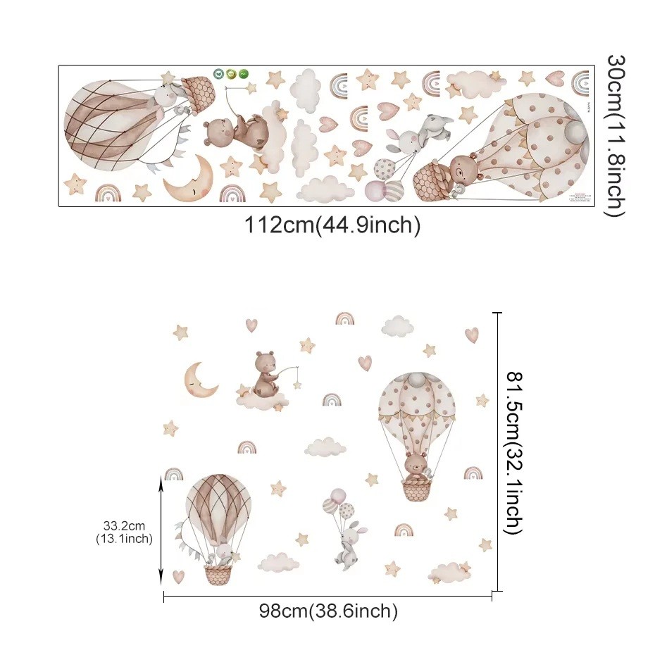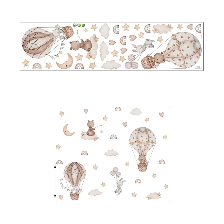 The sticker is suitable for anyone who wants to quickly and stylishly enliven a child's room without any construction work. With its gentle illustration and universal colours, the decoration appears natural, unobtrusive, and adds a cosy character to the room. The matt surface creates a pleasant, non-reflective appearance that looks beautiful in both natural and artificial lighting. The design of the bear and bunny in balloons brings positive energy, a sense of safety, and joy, which supports a healthy atmosphere for children. This sticker is an ideal choice if you want to add a gentle, fairy-tale, and loving element to the interior.