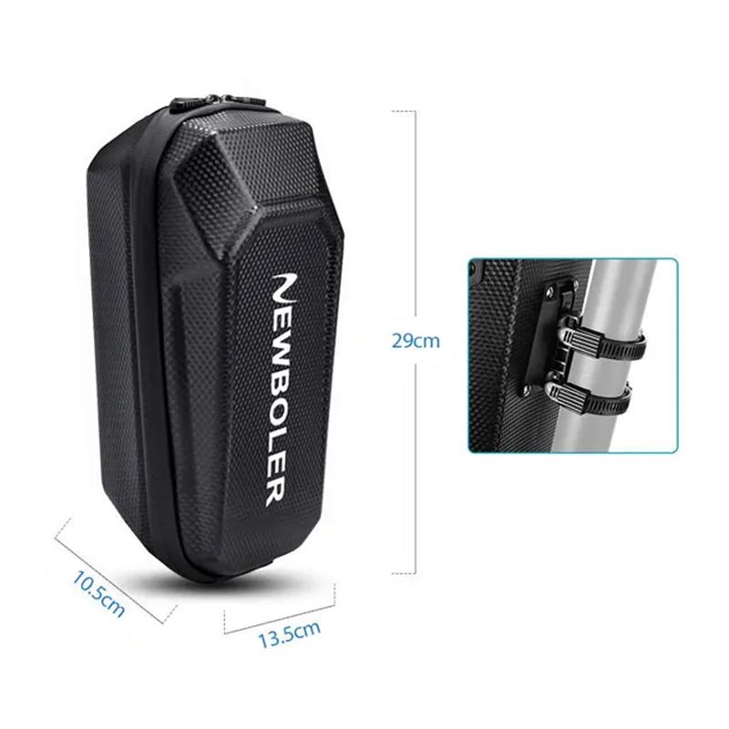 Made from hard and shape-retaining EVA material with a PU surface, it provides excellent protection against impacts and water. The quick release system allows for easy removal or attachment in just a few seconds. The modern design and compact dimensions of 29 × 13.5 × 10.5 cm ensure that the bag does not disrupt the aerodynamics of the scooter.