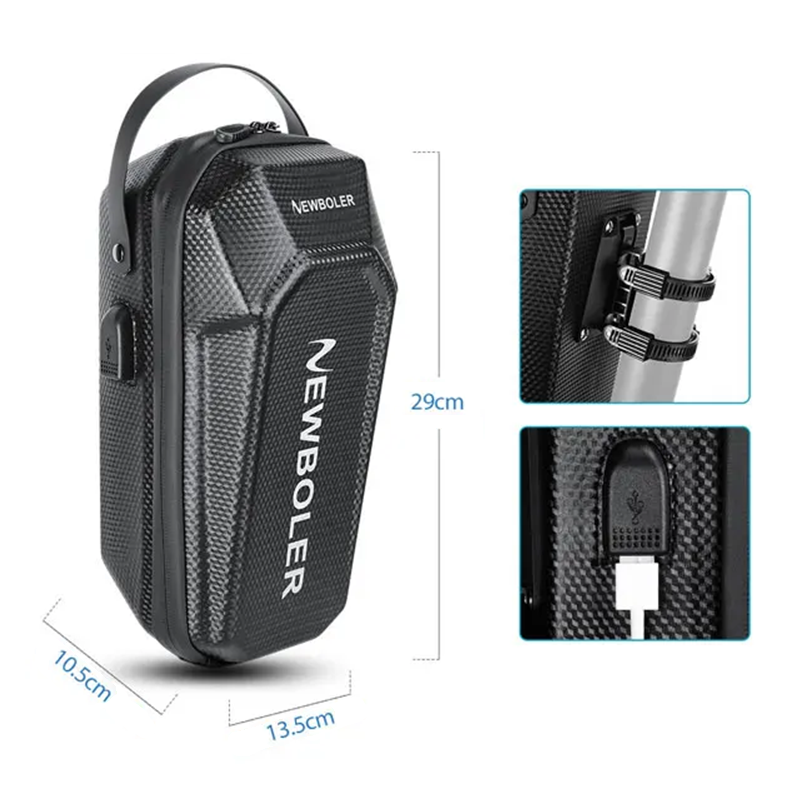 This bag is the ideal accessory for anyone who wants to keep their essentials close at hand. With the practical USB port, you can conveniently charge your phone, light, or other devices while riding. The waterproof design ensures the safety of contents even in adverse weather, and the sturdy EVA+PU construction protects stored items from impacts. The stylish and functional design will enhance the appearance of your scooter and provide the necessary comfort on every journey.