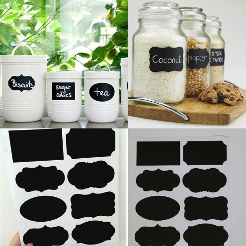 The black labels can be easily peeled off and reused. You can wipe off the chalk writing with a damp cloth.