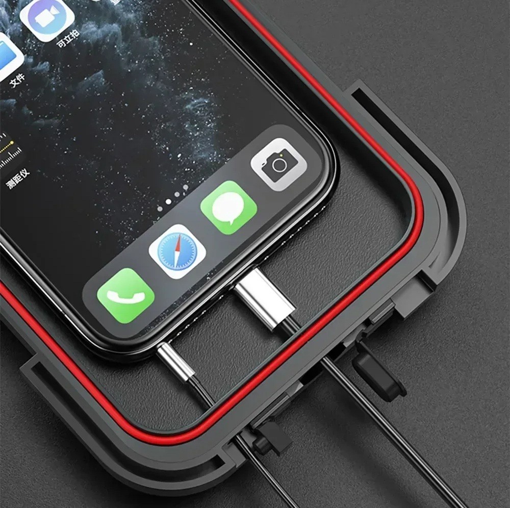 This universal phone holder is designed for safe and convenient mobile use while riding on a motorcycle or bicycle. It is made from a combination of ABS plastic, TPU, and nylon fibres, ensuring high strength, durability, and long life. The holder features a waterproof case with a touch screen, allowing you to operate your phone in the rain without needing to remove it. Inside, there is an integrated magnetic system that secures the phone, preventing it from moving even on rough terrain.