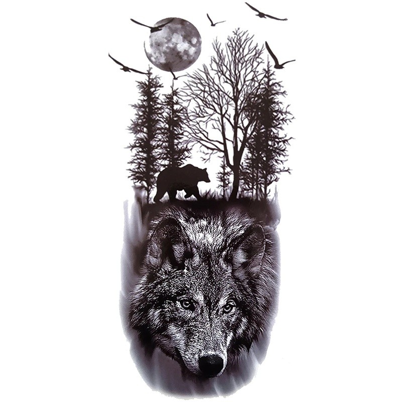 Waterproof Temporary Tattoo 21 x 11.4 cm Wolf, Bear, Forest and Full Moon Animal Motif Easy Application Durable Tattoo Natural Design