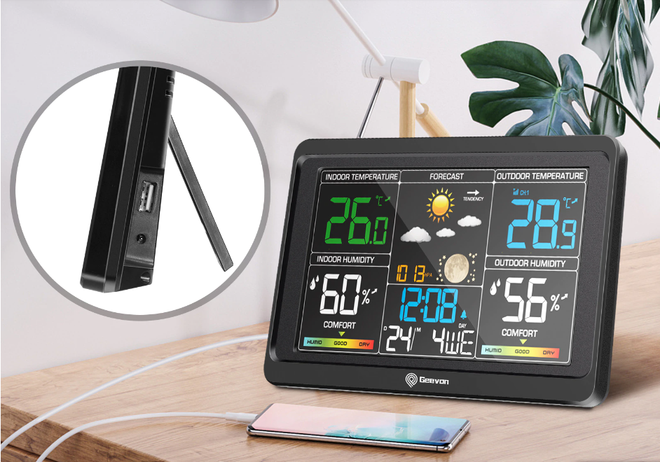 Functions: indoor and outdoor temperature, hygrometer, barometer, dual alarm clock, date, time, weather forecast