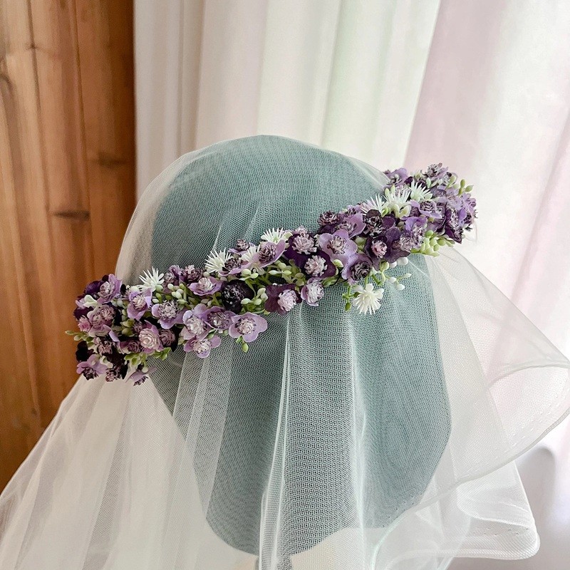 The wedding floral crown with tulle veil is the perfect accessory for brides who desire a romantic and natural look. The densely arranged delicate flowers create a rich composition that appears elegant and festive. The lightweight tulle veil flows with the hairstyle, adding airiness and softness to the overall styling. This hair accessory is an ideal choice for outdoor weddings, classic ceremonies, and wedding photography.