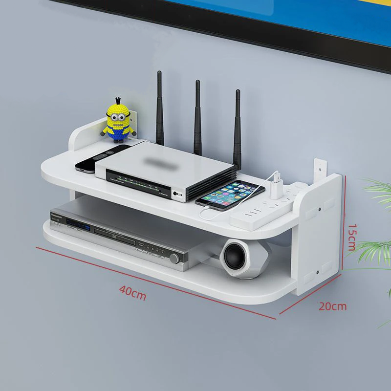 Two-tier wall-mounted shelf with installation without drilling. Ventilation holes for heat dissipation, versatile use in the home or office. Full description