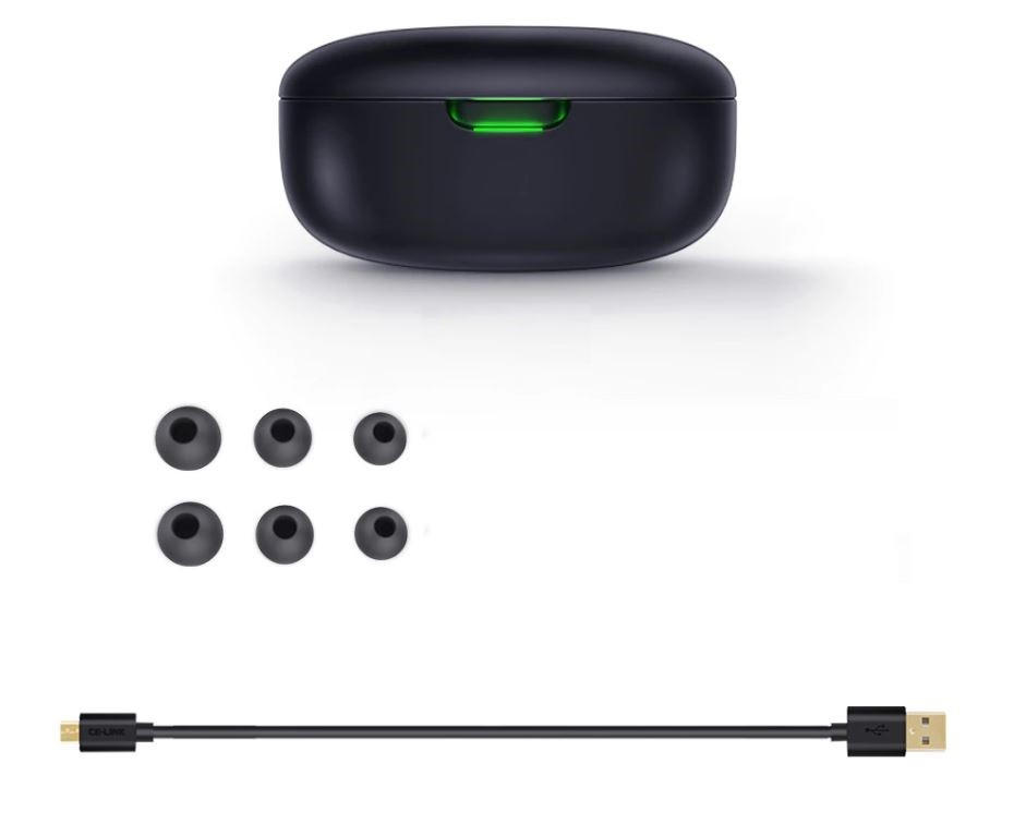Contents of the package: 2x earphones, 1x case, 6x silicone tips, 1x charging cable