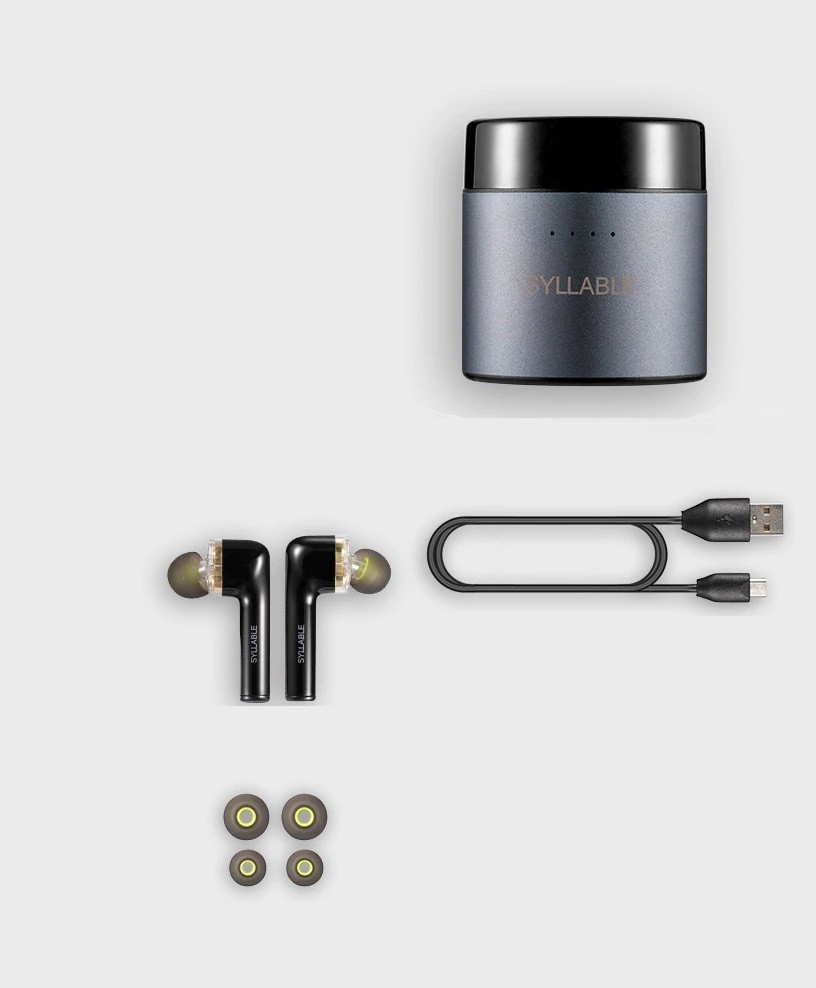 Contents of package: 2x headphones, 1x case, 1x USB charging cable, 4x silicone ear tips