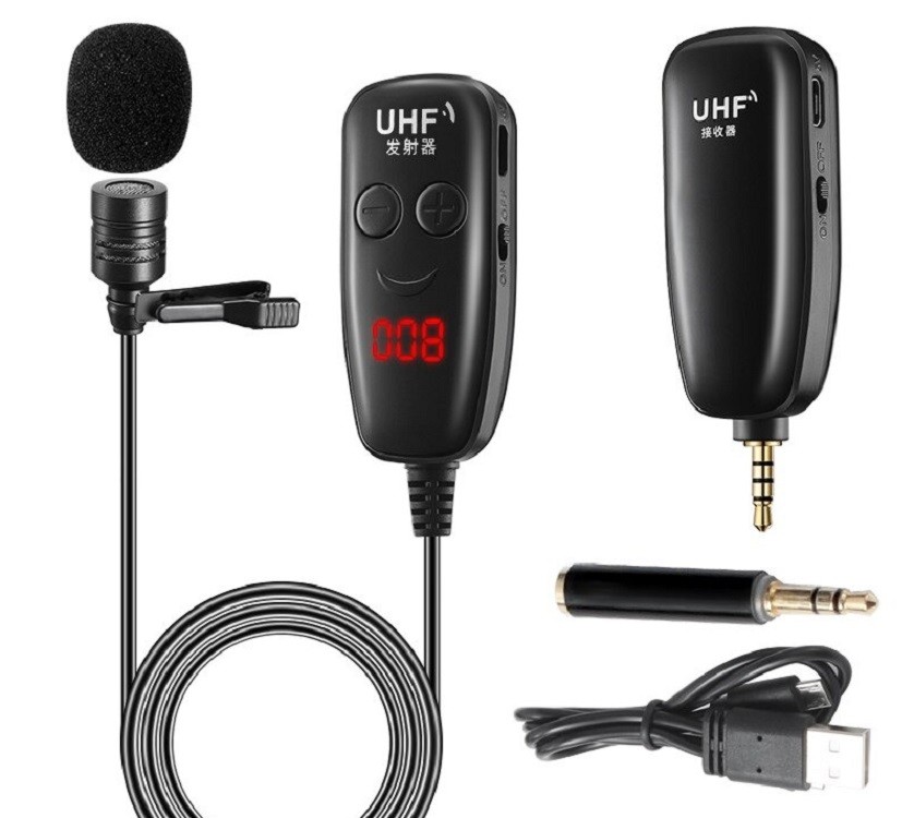 Package Contents: 1x microphone with receiver, 1x transmitter, 1x 3.5 mm jack adapter, 1x charging USB cable