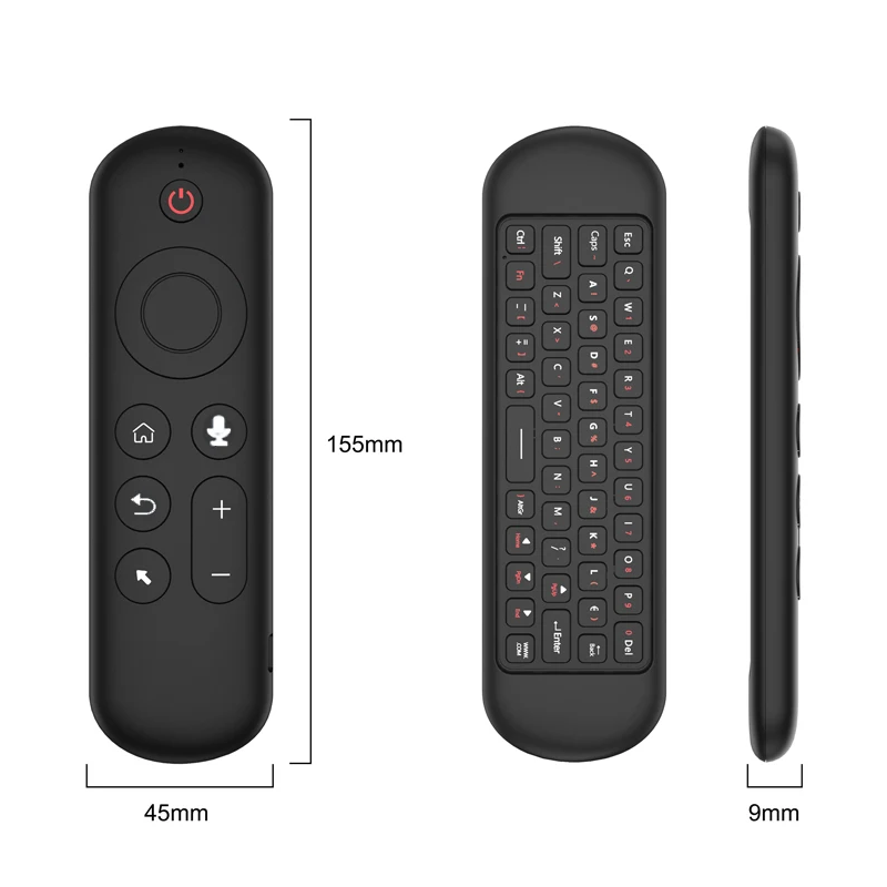 This compact wireless mini keyboard with remote control is the ideal solution for convenient control of smart TVs, PCs, Android boxes, or multimedia centres. It offers voice control, Bluetooth connectivity, and a 2.4GHz wireless receiver for maximum compatibility. With 7 colour backlighting, it is comfortable to use even in low light conditions. The ergonomic shape ensures easy handling and intuitive use.