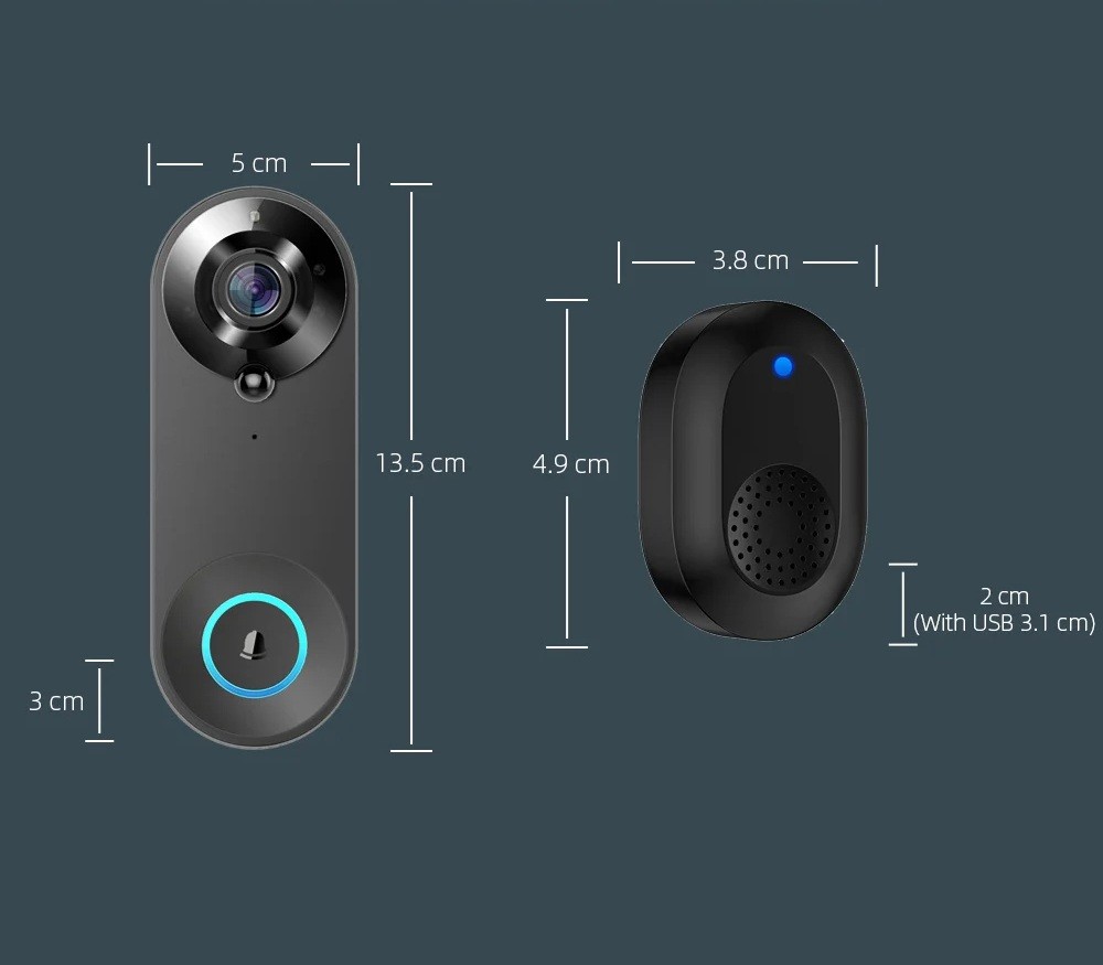 - Dimensions of the outdoor doorbell: 13.5 x 5 x 3 cm