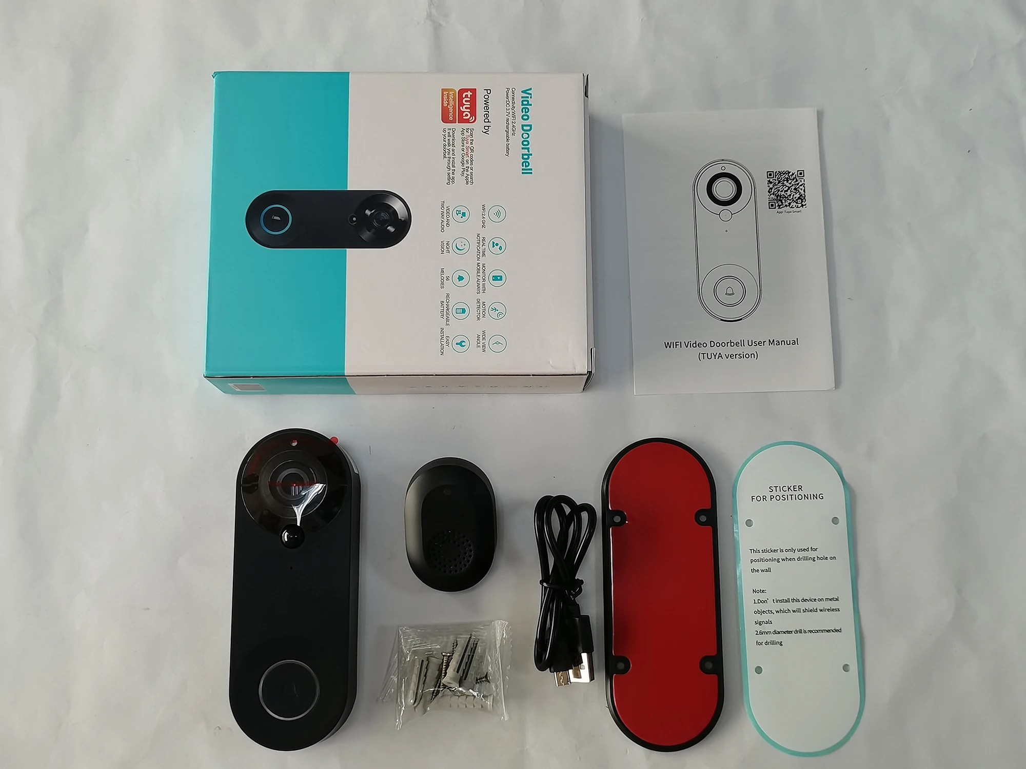 two-way audio transmission, it is possible to communicate directly with the visitor via your phone. The video doorbell supports recording on a TF memory card with a maximum capacity of 128 GB. Power is provided by a built-in rechargeable battery, which can be charged via USB. The device operates with a WiFi connection in the 2.4 GHz band and is compatible with the Tuya Smart Home platform. The set also includes an indoor doorbell alert for use inside. The design is intended for outdoor use and long-term operation.