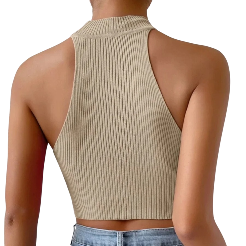 The top is an ideal choice for women who want to create a stylish and contemporary outfit without unnecessary complexity. The beige colour appears soft and luxurious, making it suitable for both light and dark combinations. The crop top length pairs perfectly with high-waisted trousers and skirts. The wide straps around the neck and roll neck give the outfit a unique character. If you are looking for a modern and comfortable top that highlights your style, this women's crop top is a great choice.