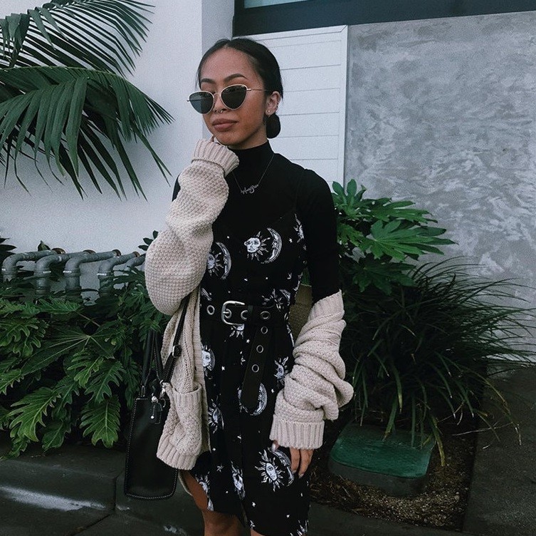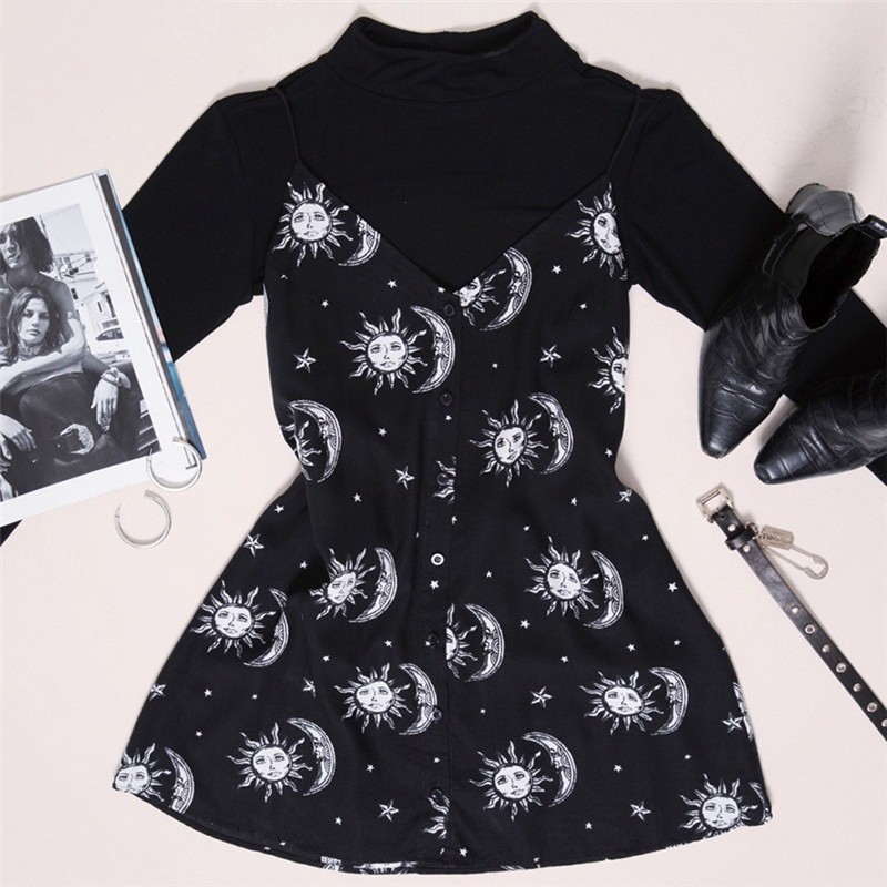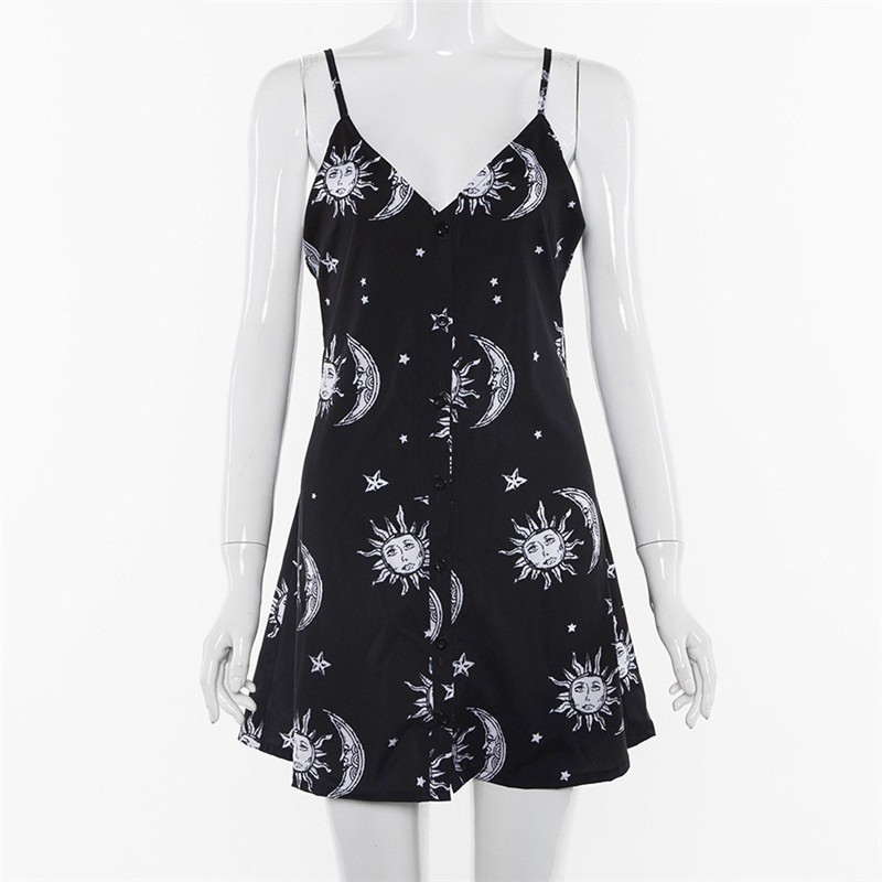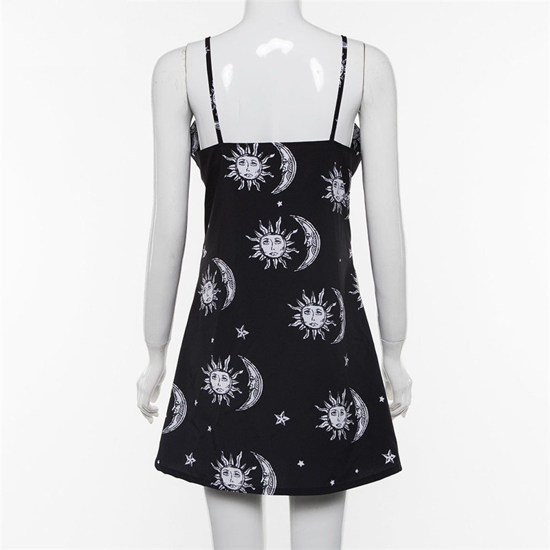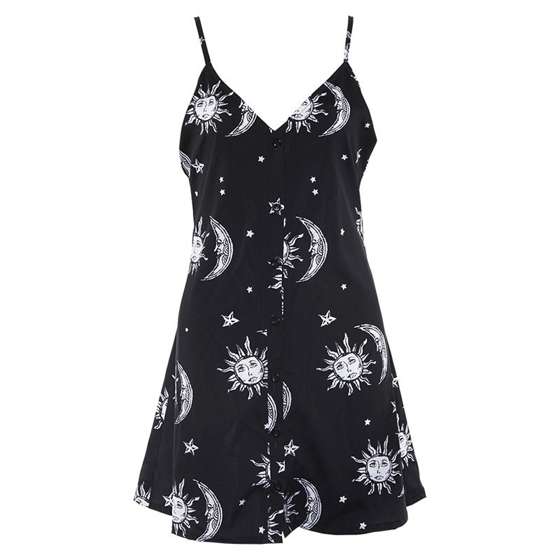 Women's dress with a print of the sun, moon, and stars.