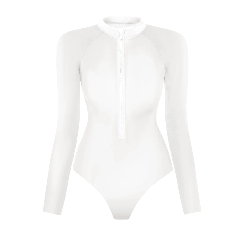 One-piece swimsuit with long sleeves and a zip in the neckline made from stretchy material. Ideal for swimming, surfing, and active holidays. Full description