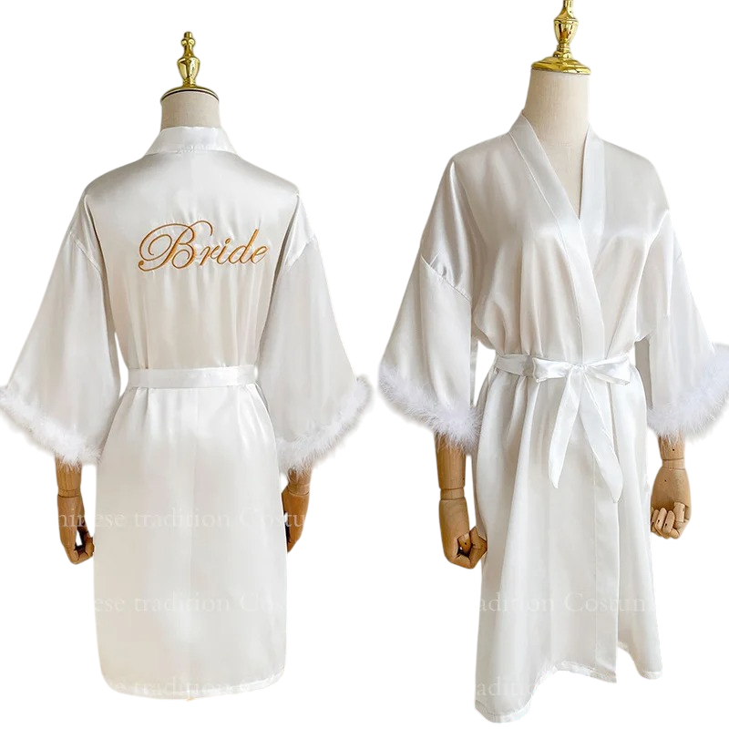Home page Home page Clothing & Accessories Women’s Clothing Women’s Nightwear Women’s Bathrobes Women's Robe with Plush Sleeve Trim Bride Print Waist Tie Lightweight Polyester and Satin Wedding Robe