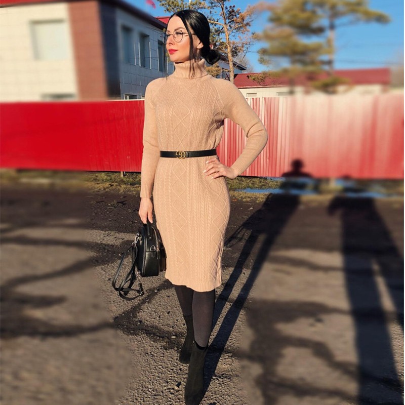 Women's autumn sweater dress with a roll neck.