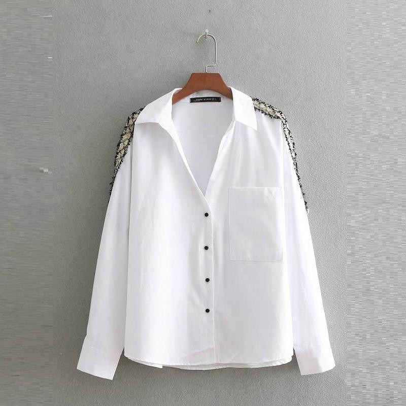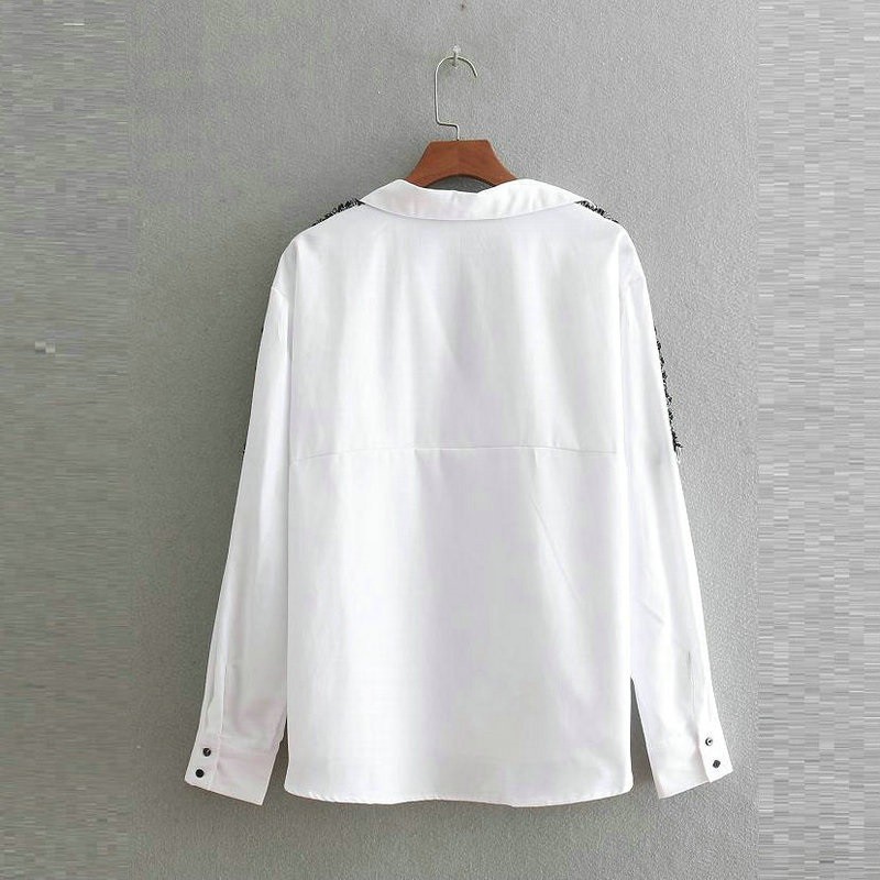 A classic white shirt, enlivened by a beautiful decoration on the shoulders.